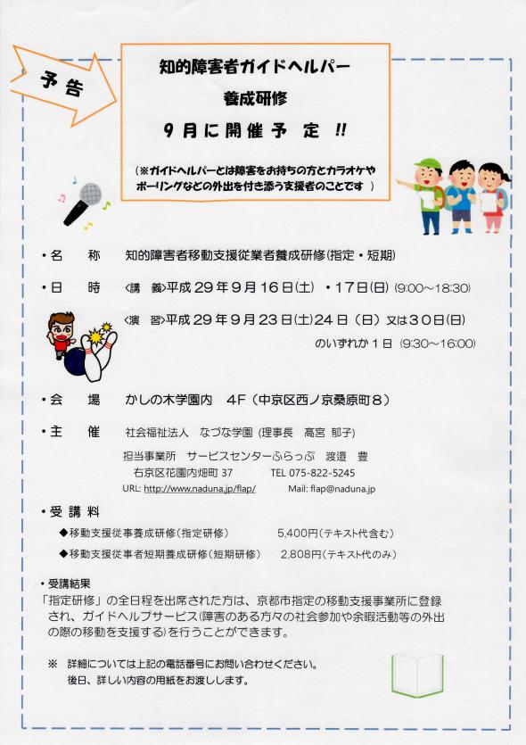 また、京都市知的(精神)障害者ガイドヘルパー短期養成研修も同時開催します。ご興味のある方、奮ってご参加ください。