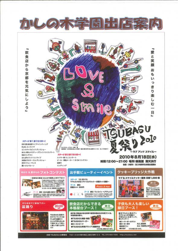 今年の夏も開催されます“TSUBASU 夏祭り 2010”に、かしの木学園も出店します。 暑さに負けずにはりきっていきたいと思います☆ とっても素敵なイベントも盛りだくさん♪ ぜひ、のぞいてみてください!! 日時:平成22年8月18日(水) 12:00~21:00 場所:新風館(烏丸三条上る) ※雨天決行