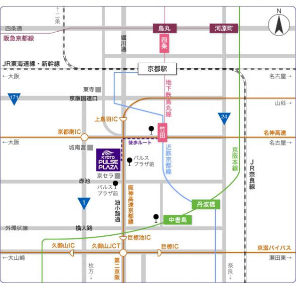 地下鉄・近鉄「竹田駅」北西4番出口から市バス又は京阪バス「パルスプラザ前」下車