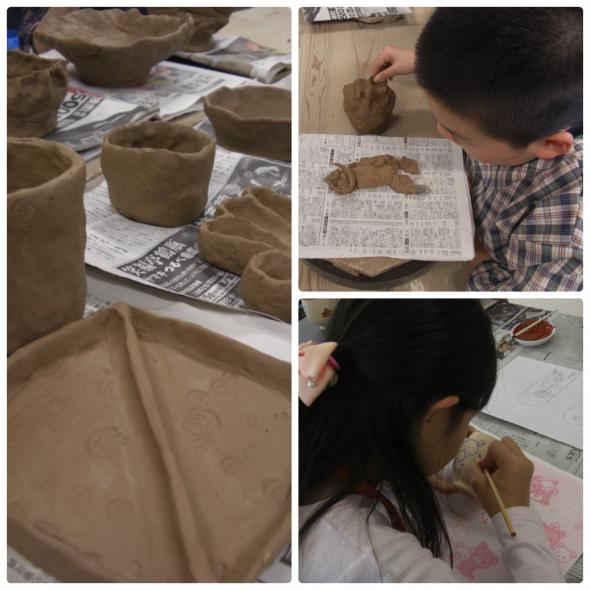 午前中は御前児童館の子供たちがお湯のみに絵付け体験を、午後は放課後等デイサービス「わかな」の子供たちが手びねり体験をしました。