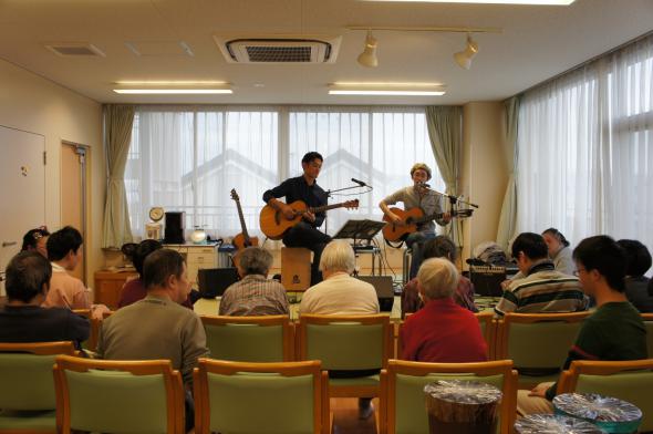 11月17日(木)、かしの木の食堂がなんとライブ会場に変身! ギタリストの大樹さんと歌手のリーチさんをお迎えしてのかしの木ライブ。 事前に作った手作りマラカスや太鼓を鳴らしたり、得意の楽器を持ってこられた方もおられました!踊りたくてたまらない!と汗をかきながら踊られる方も♪ リーチさんの優しい歌声と大樹さんのギターテクニックに酔いしれた時間でした♪