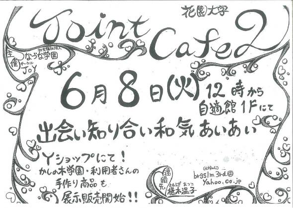 花園大学サークルジョイと京都市かしの木学園となづな学園の協働で花園大学とYショップの協力を得て下記のように第2回JOINT CAFEを開催することとなりました。皆さんお誘いの上ご来店ください。 また、当日6月8日(火)より花園大学校内Yショップにて、かしの木学園となづな学園の作品を常設で展示販売することになりました。皆様近所にお越しの際はぜひお立ち寄りください。 記 とき:平成22年6月8日(火) 午後0時~午後3時 場所:花園大学 自適館(じてきかん) 1階学生ホール