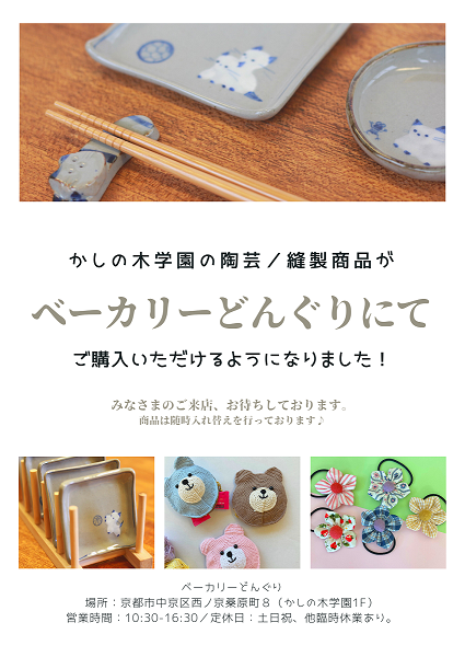かしの木学園・ベーカリーどんぐりにて、陶芸・縫製商品の販売をはじめました! みなさまのご来店心よりお待ちしております。 ベーカリーどんぐり 場所:京都市中京区西ノ京桑原町8(かしの木学園1F) 営業時間:10:30-16:30/定休日:土日祝、他臨時休業あり。