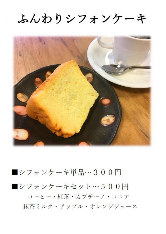 ほんのり甘く、ふわふわのシフォンケーキです。 ドリンクとセットでお得☆