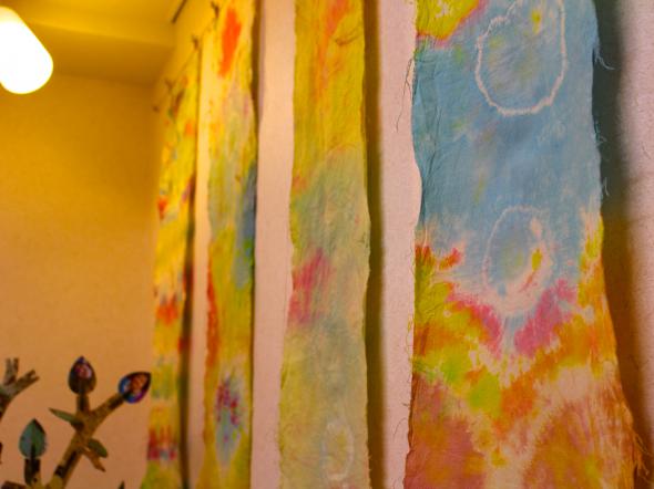 今回の展示は染物です。麻の布を、京都造形芸術大学の学生さんといっしょに色とりどりに染めています。布をねじったりくくったりして染める“しぼり染め”の技法です。 個性豊かに染められた展示空間をご堪能ください。 ギャラリー営業時間:午前9時30分~午後3時30分 場所:カフェなづな