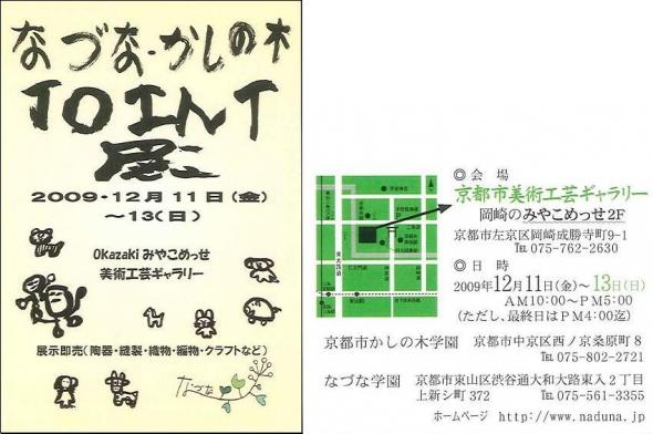 今年度は初めてなづな学園とかしの木学園合同でJOINT展を開催します。それぞれの学園で作った製品を一同に集め、展覧・販売を行います。利用者が一生懸命作った製品を是非見に来てください。 日時 平成21年12月11日(金)~12月13日(日) 午前10時~午後5時まで(最終日は午後4時まで) 場所 みやこめっせ 美術工芸ギャラリーA