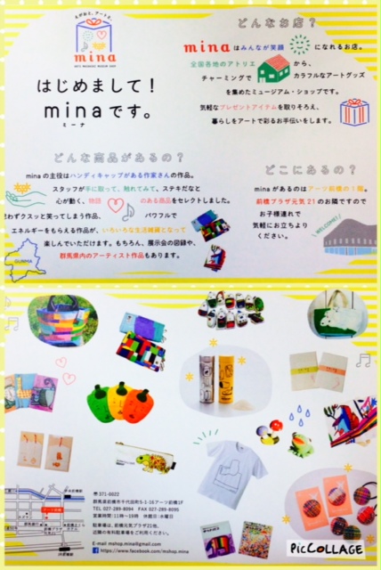 群馬県前橋市にあるアーツ前橋1階『mina』(ミーナ)様にて、なづな学園の商品を置いていただくことになりました。今年の7月にオープンした、ハンディキャップのある作家さんの作品を全国からセレクトしたミュージアムショップです。 なづな学園からは、ポピーふろしきを販売していただいています。