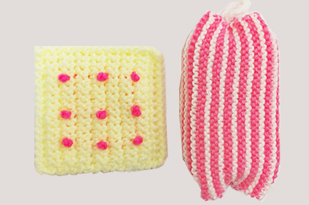 洗剤いらずで、手にも環境にも優しい、カラフルポップなアクリルたわしです。