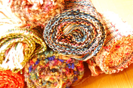 コットンやウール様々な糸を使い、手織のショールやマフラー、バッグ、コースター等を製作しています。