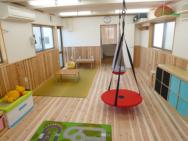 平日は、吊り遊具・楽器、その他おもちゃを使っての自由遊びや、学校の宿題等の個別療育を行なっています。早帰りなどわかなで過ごす時間の長い日は、創作活動、室内運動遊びやおやつ作りをしたり、近くの公園におでかけに行ったりします。