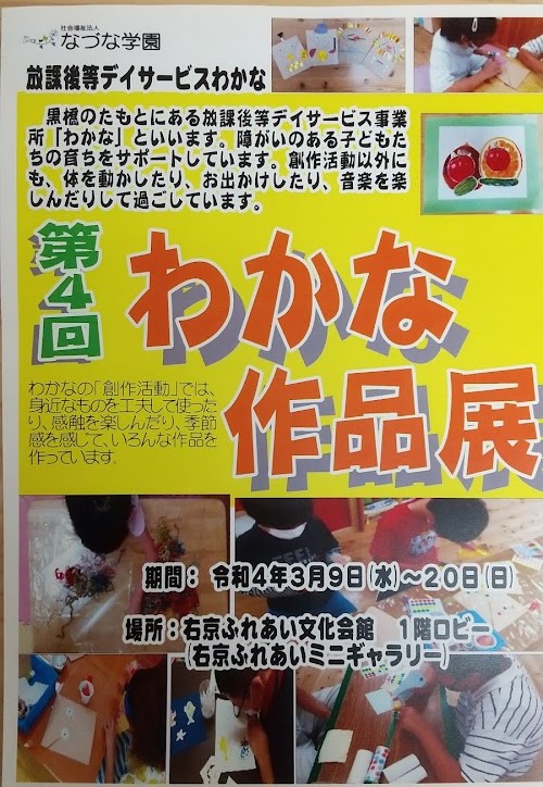 今年もわかな作品展をやります!! 創作活動では、いろんな素材の感触を確かめたり、技法を楽しみながら、作品作りをしています。 作品を通して、子供たちの様子や作品作りに取り組んでいる様子を知っていただける機会になると思います。 見ると思わず微笑んでしまう、そんな作品がたくさんありますので、ぜひお近くにお立ち寄りの際は、覗いてみてください☆ 期間:令和4年3月9日(水)~20日(日) 場所:右京ふれあい文化会館1階ロビー(右京ふれあいミニギャラリー)